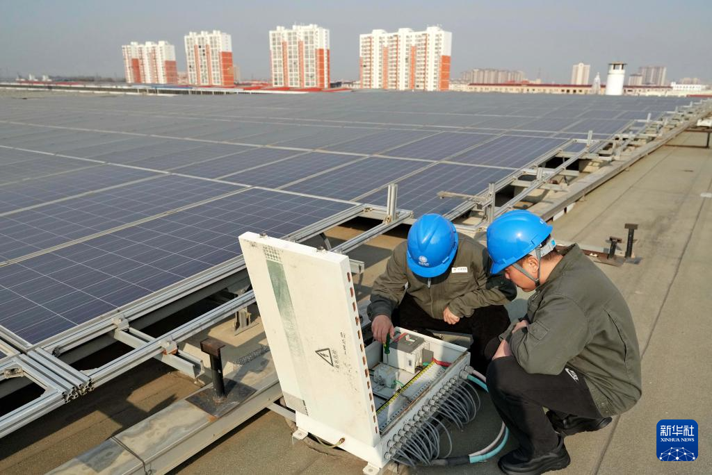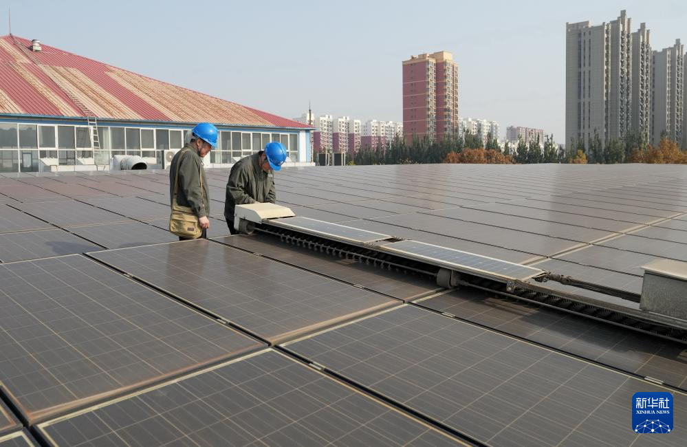 11月23日,工人在河北省保定市徐水区一家企业厂房屋顶上检修光伏发电板的清洁设备。