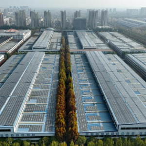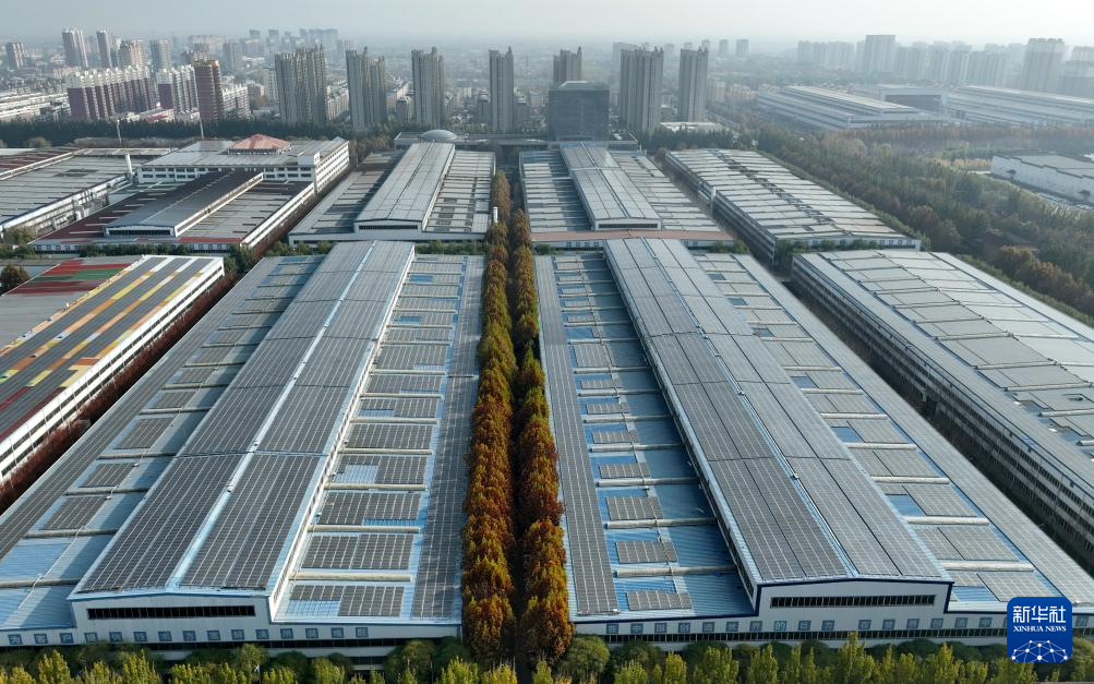 11月23日拍摄的河北省保定市徐水区一家企业厂房屋顶上的光伏发电板(无人机照片)。