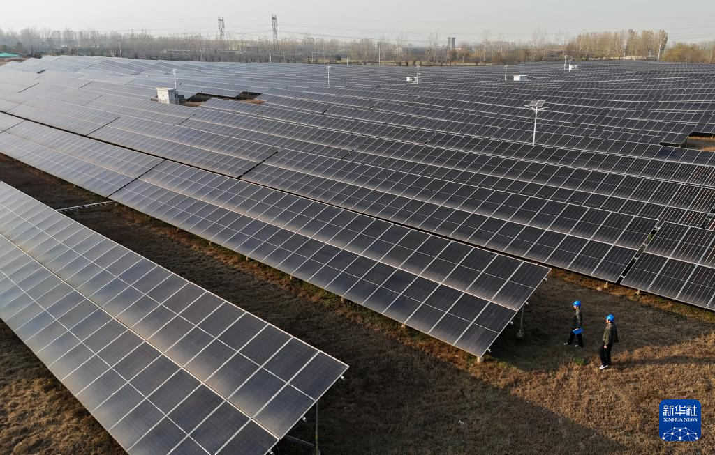 11月23日,工人在河北省定州市长安路街道孟家庄村附近的一处光伏发电场巡检(无人机照片)。