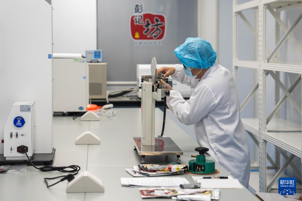 11月24日,在湖南宁乡经开区一家预制菜企业食品检测中心,工作人员在检测食品包装材料。