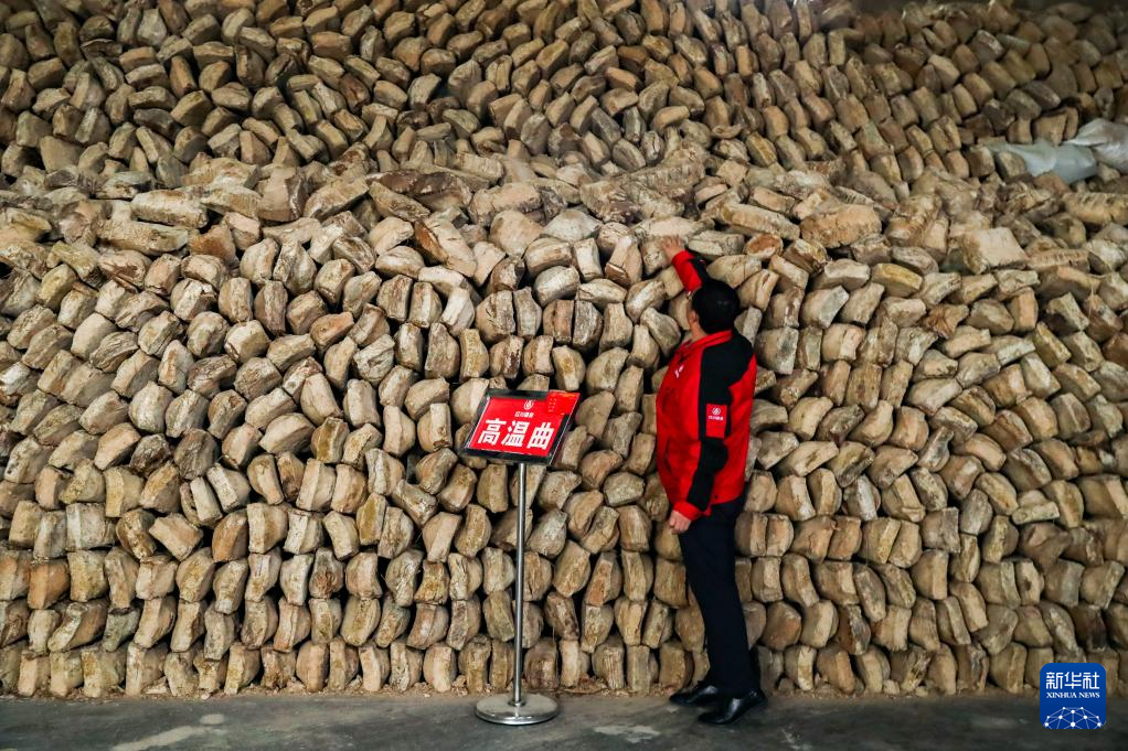 11月21日,在甘肃陇南经济开发区一家白酒企业厂区,甘肃省级非遗红川酒酿造技艺传承人张博在观察古法制作的酒曲干燥情况。