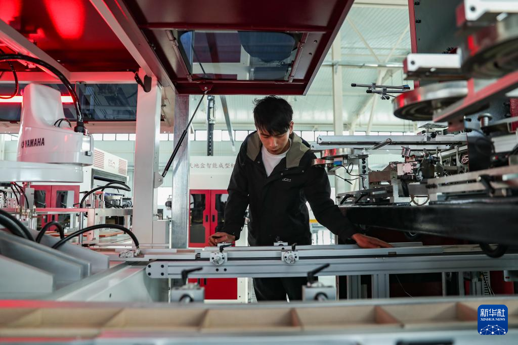 11月21日,在甘肃陇南经济开发区一家纸箱包装企业生产车间,工作人员在调试新设备。