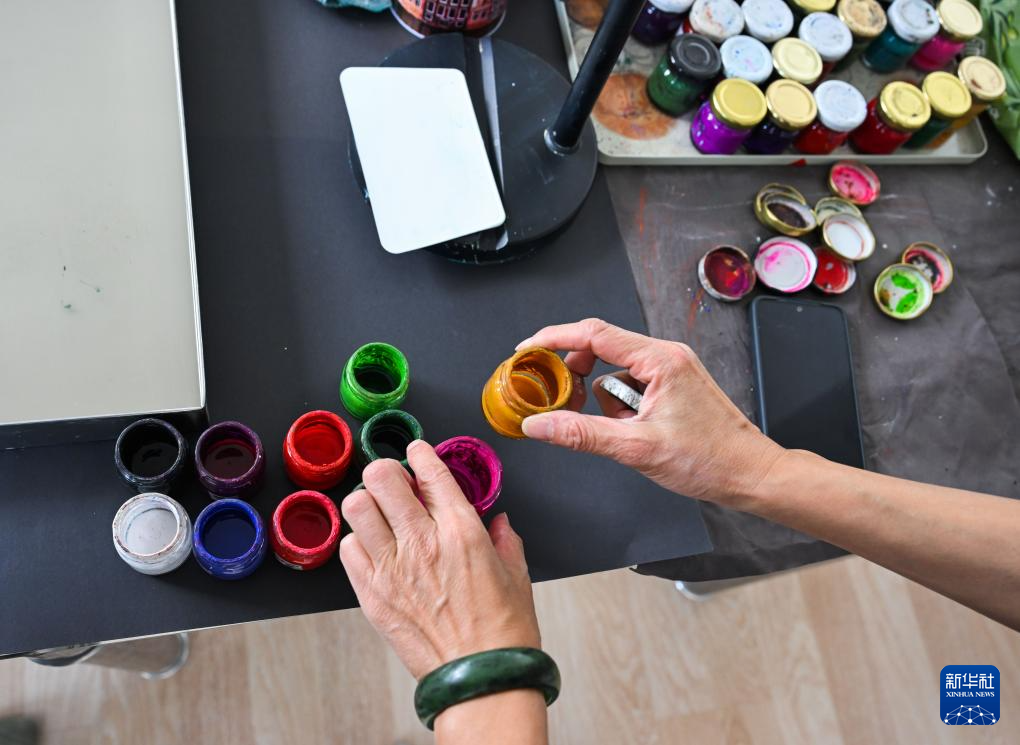 11月5日,李昕桐在土耳其伊斯坦布尔的家中测试水拓画颜料。