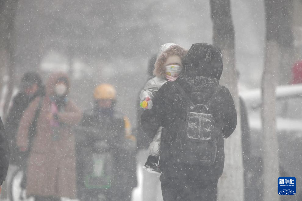 11月25日,在黑龙江省齐齐哈尔市,市民抱着孩子在雪中行走。