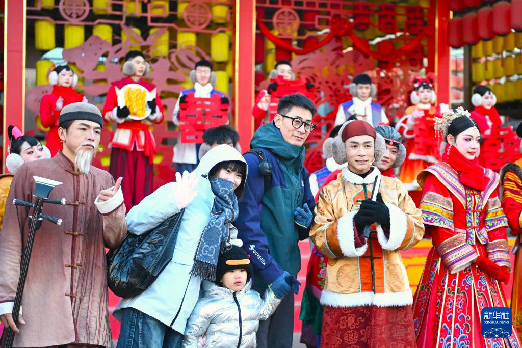 11月25日,游客在银川市漫葡·看见贺兰沉浸式演艺小镇与演员合影。