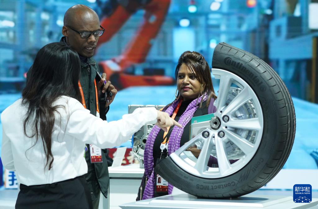 11月27日,外国参观者在链博会先进制造链展区参观一款轮毂电机产品。