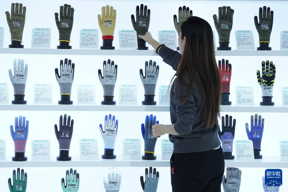 11月27日,在链博会先进制造链展区的中国资源循环集团展位上,参展商整理利用废旧纺织品生产的高性能防护手套。