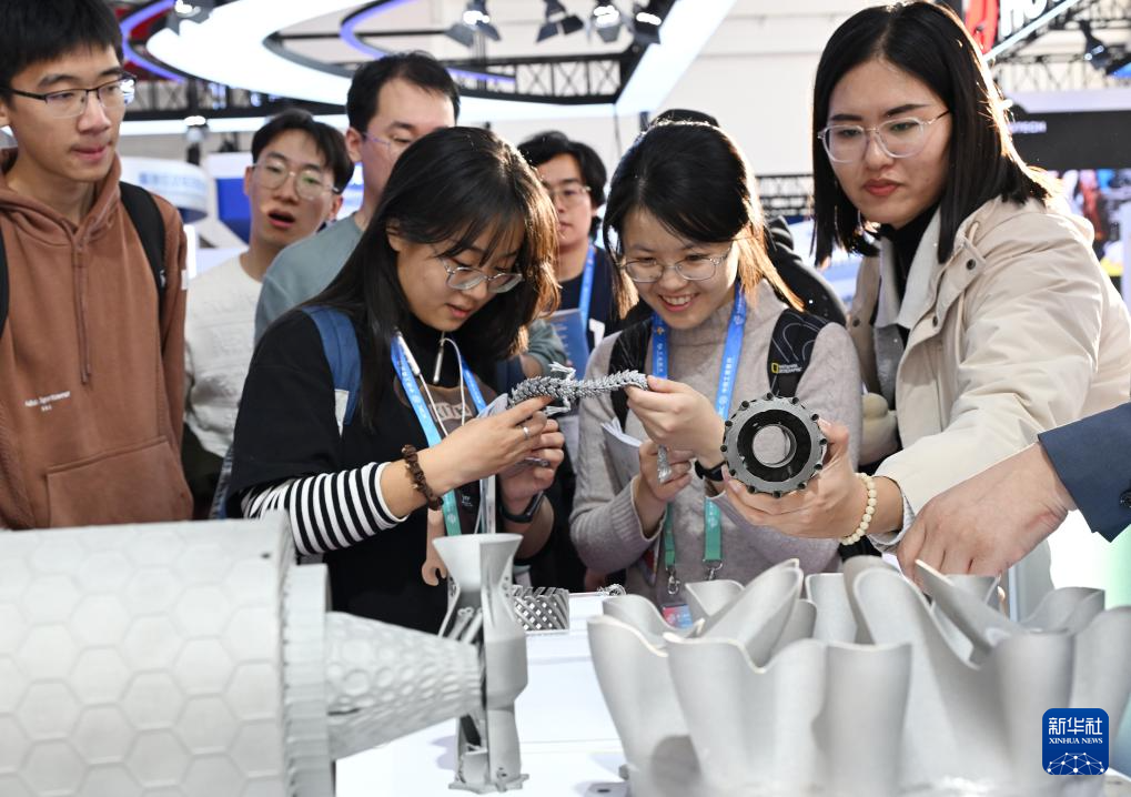 11月27日,在链博会先进制造链展区大族激光展台,参观者观看激光3D打印金属制品。