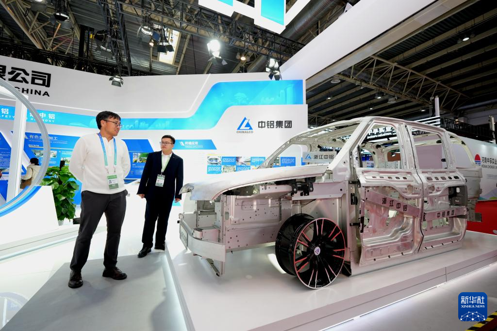 11月27日,在第二届中国国际供应链促进博览会中铝集团展台,参观者在了解全铝白车身产品。
