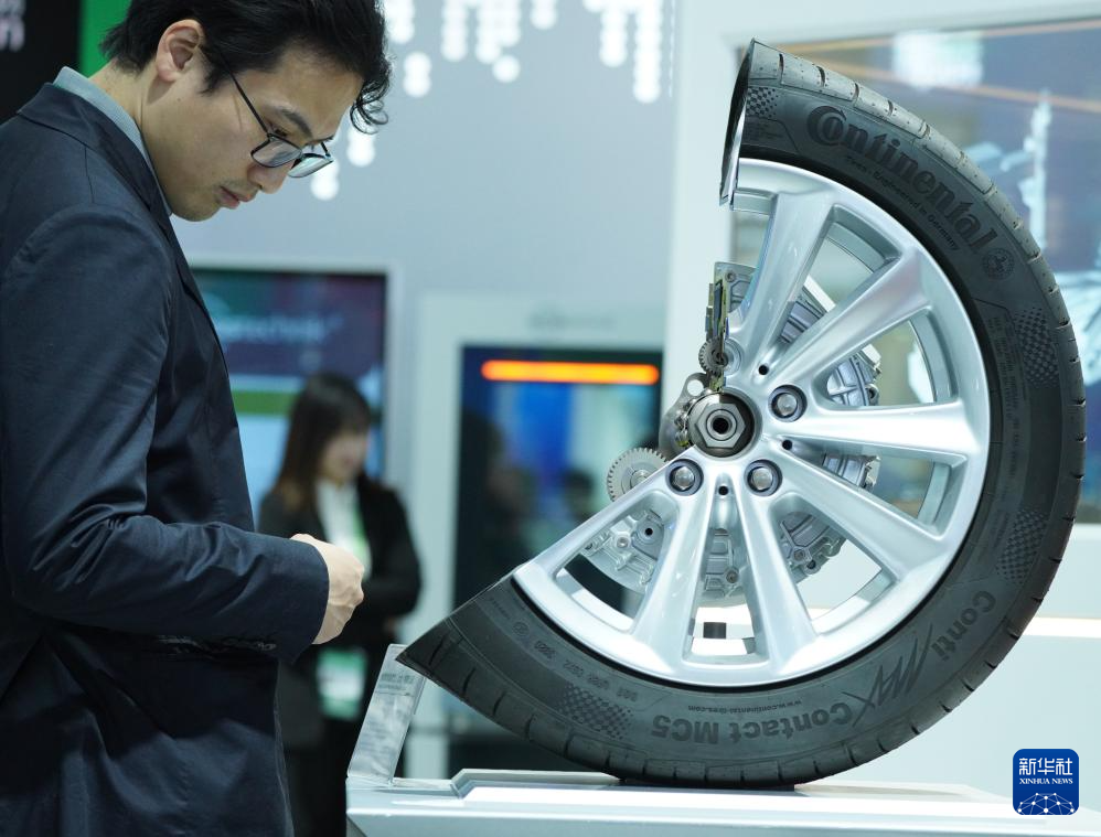 11月27日,参观者在链博会先进制造链展区参观一款轮毂电机产品。