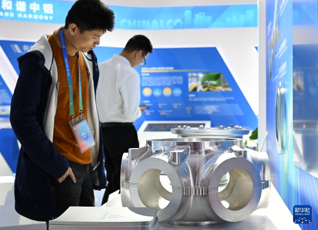 11月27日,参观者在链博会先进制造链展区中铝集团展台前观看航空材料部件。