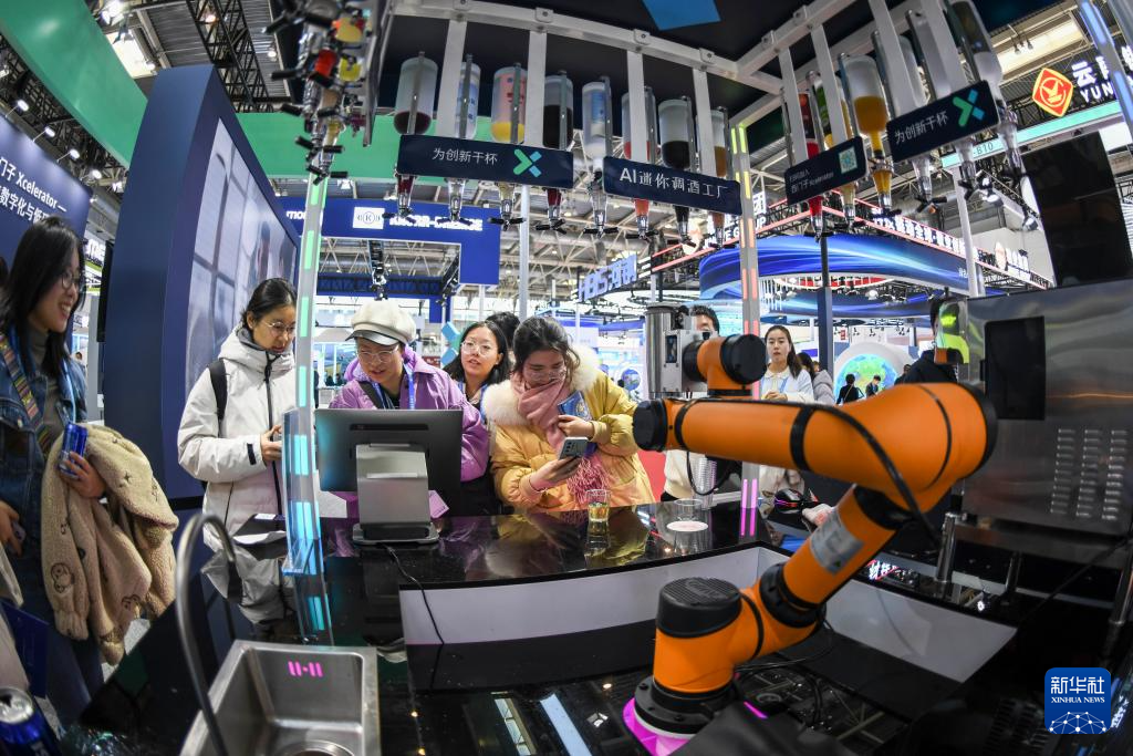 11月27日,人们在第二届中国国际供应链促进博览会先进制造链展区西门子展台参观AI迷你调酒工厂。