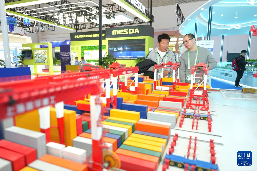 11月27日,人们在第二届中国国际供应链促进博览会先进制造链展区中交集团展台参观上海洋山四期自动化码头模型。