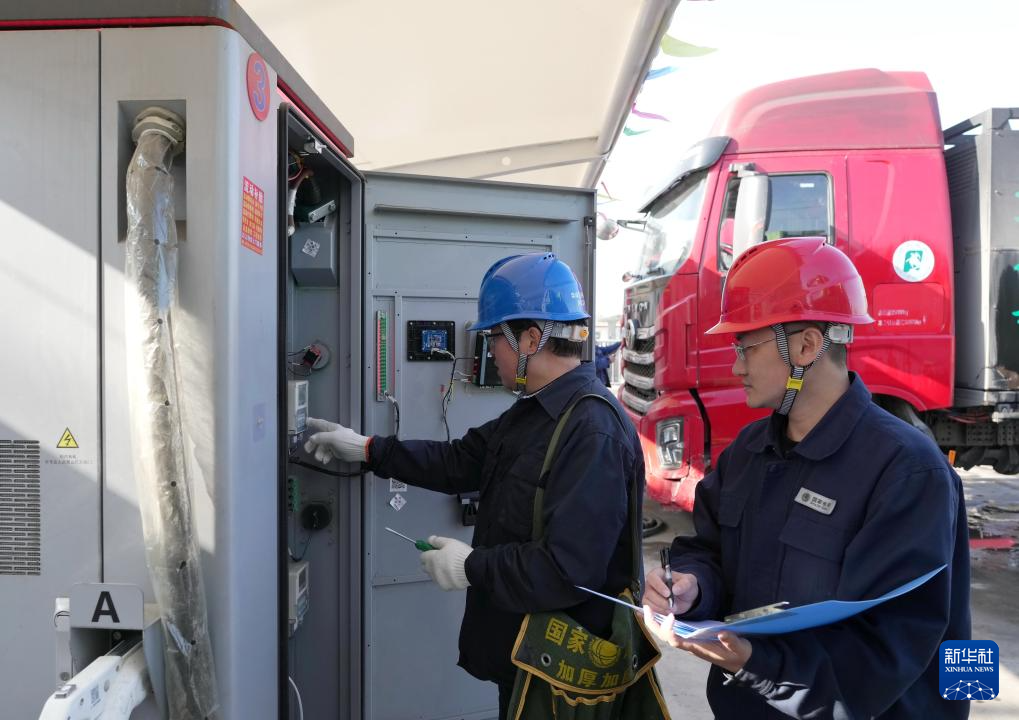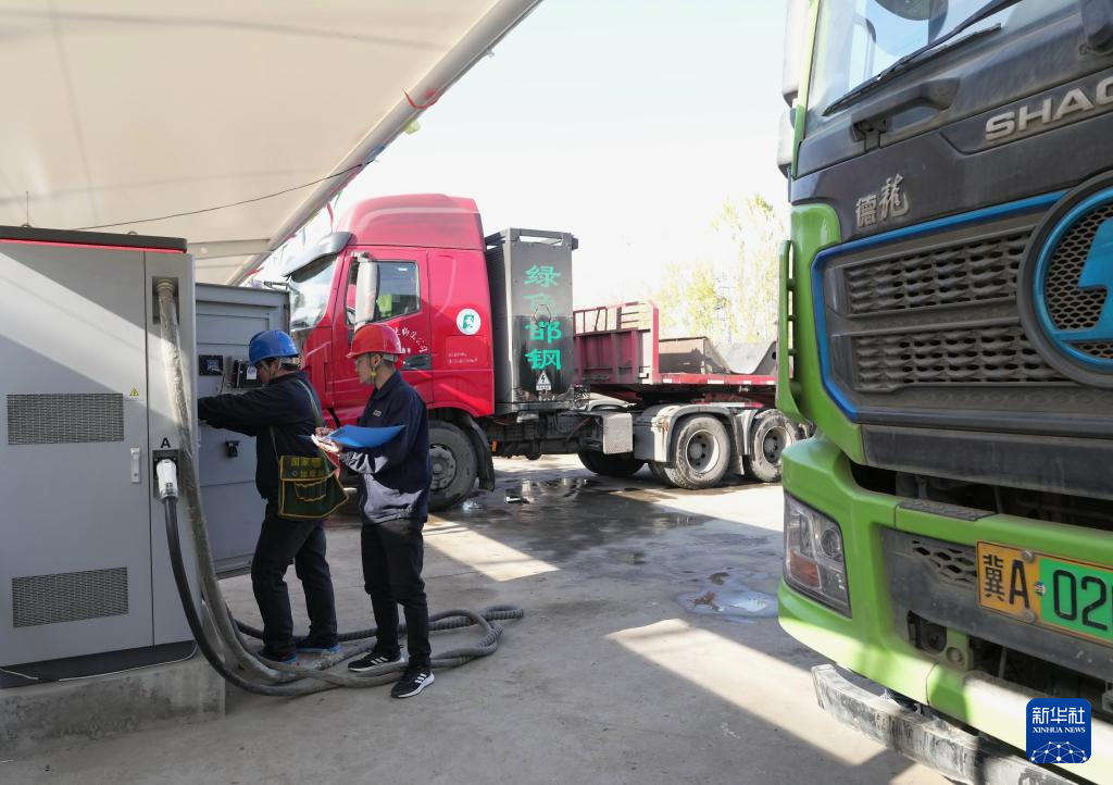 11月27日,工人在石家庄市栾城区装备制造产业园一处重卡充电站巡检。