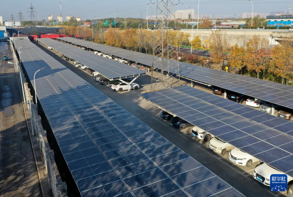 这是11月27日拍摄的石家庄市栾城区装备制造产业园一家企业停车场顶棚上的光伏发电板(无人机照片)。