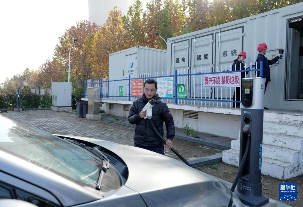 11月27日,市民在石家庄市栾城区装备制造产业园一座储能电站旁,准备给电动汽车充电。