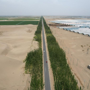 在新疆和田地区和田县拍摄的防护林带,道路两边是沙漠饲草基地和设施农业基地(6月20日摄,无人机照片)。