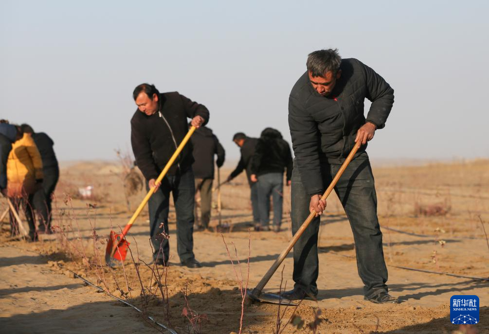 11月28日,在新疆于田县万花园防沙治沙示范区,各族干部群众加紧栽种玫瑰花苗。