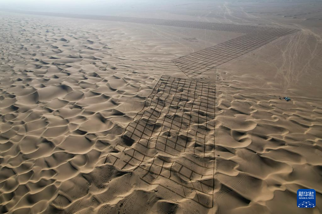 11月27日,在新疆和田地区皮山县科克铁热克镇至叶城县方向沙漠“锁边”空白区,施工人员在搭建高立式沙障(无人机照片)。