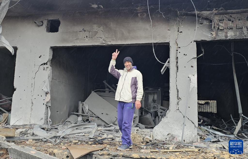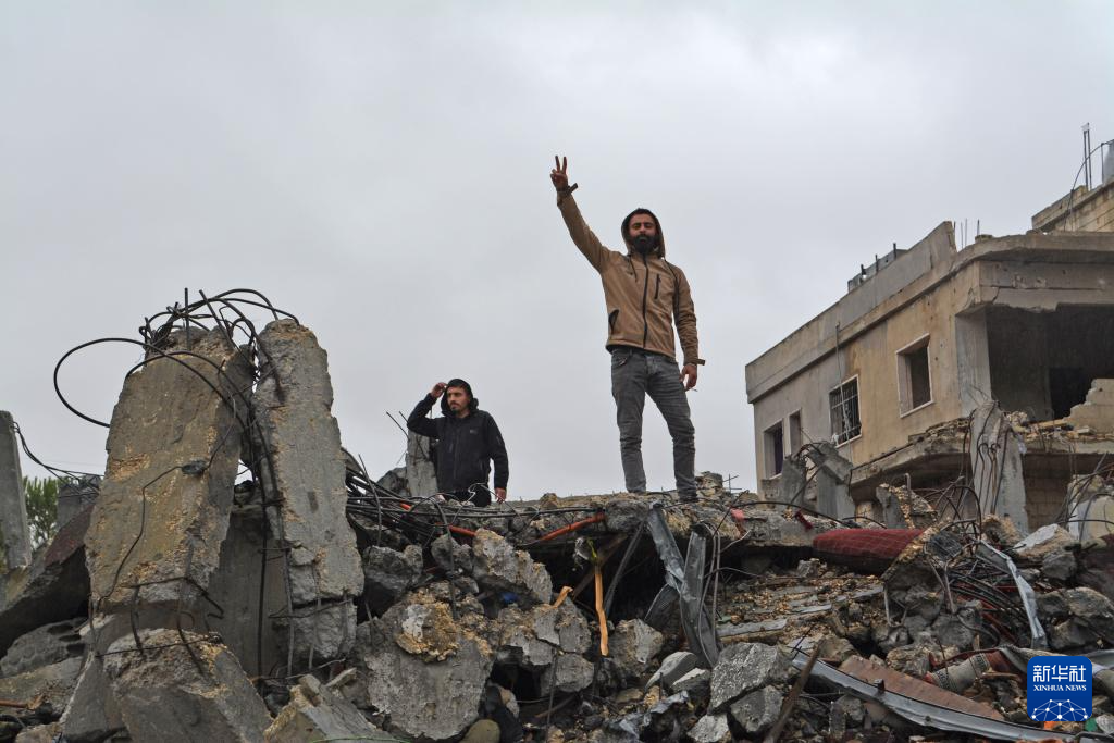 11月27日,在黎巴嫩东部贝卡地区,一名男子在房屋废墟上做出胜利手势。