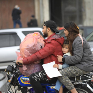 11月27日,在黎巴嫩贝鲁特南郊,人们骑着摩托车返回家园。