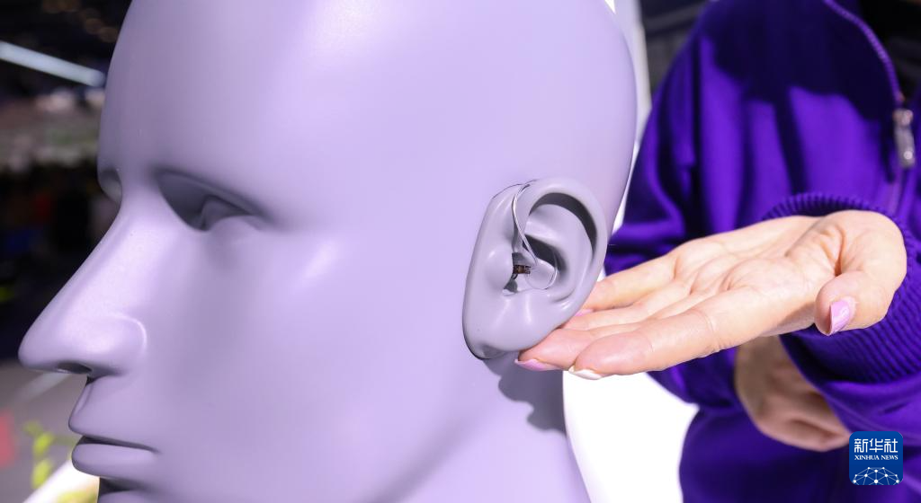 11月28日,来自博音听力技术(上海)有限公司的工作人员在展示一新款助听器产品。