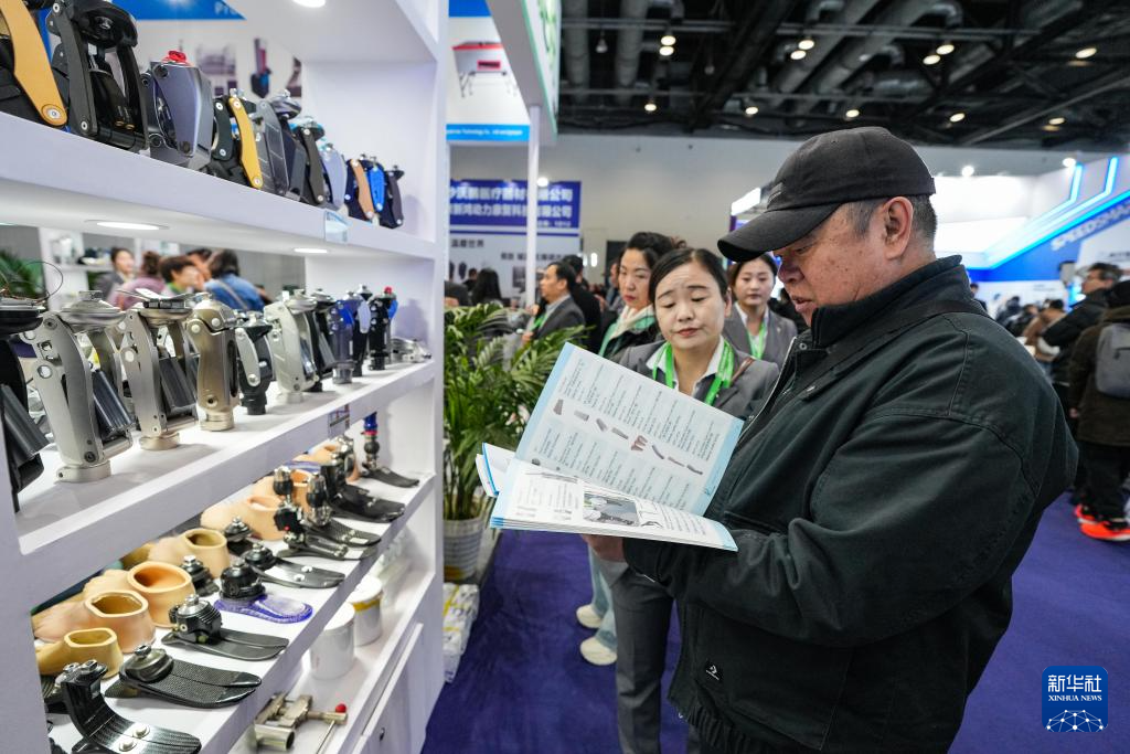 11月28日,一名参观者在一假肢膝关节展位旁了解产品情况。