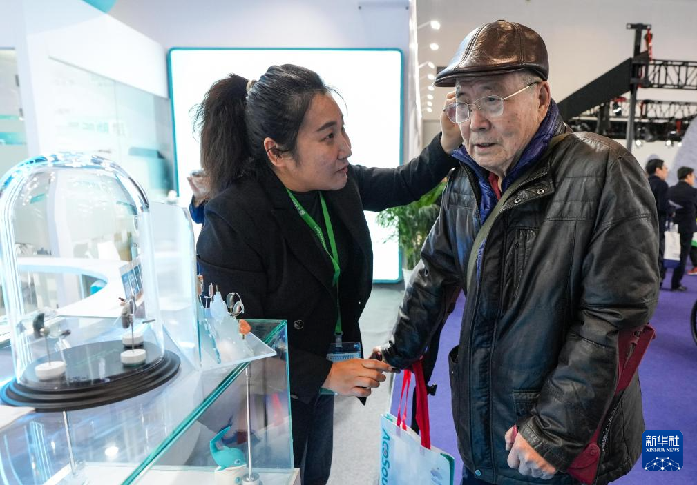 11月28日,参展工作人员帮助一名参观者佩戴助听器产品。