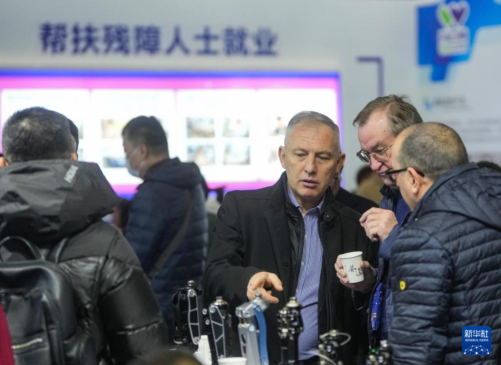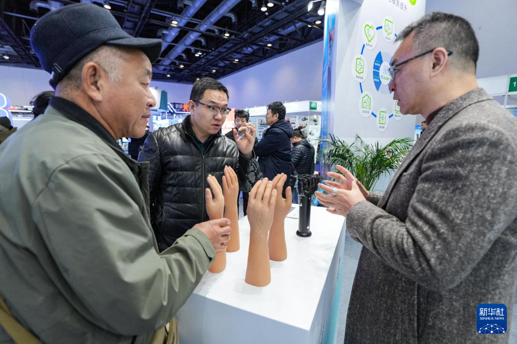 11月28日,参观者在一展台旁了解智能仿生假肢和美观假肢产品的相关情况。
