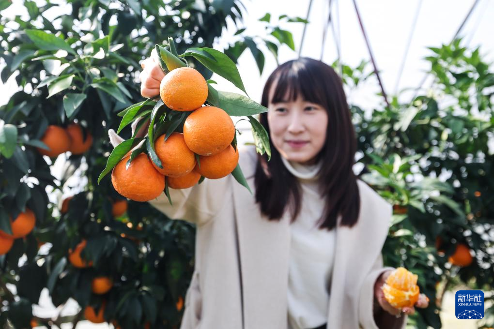 11月28日,游客在浙江壹嘉亿农业科技有限公司种植大棚里采摘“红美人”柑橘。