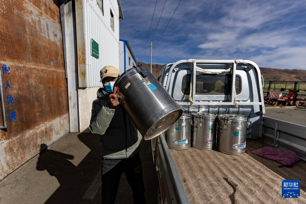 11月28日,牧民次仁顿珠在收奶站搬运奶桶。