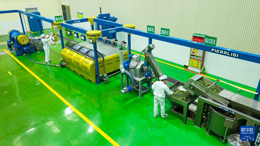 11月1日,在甘肃省陇南市武都区一家油橄榄加工企业,工作人员在生产线上作业。