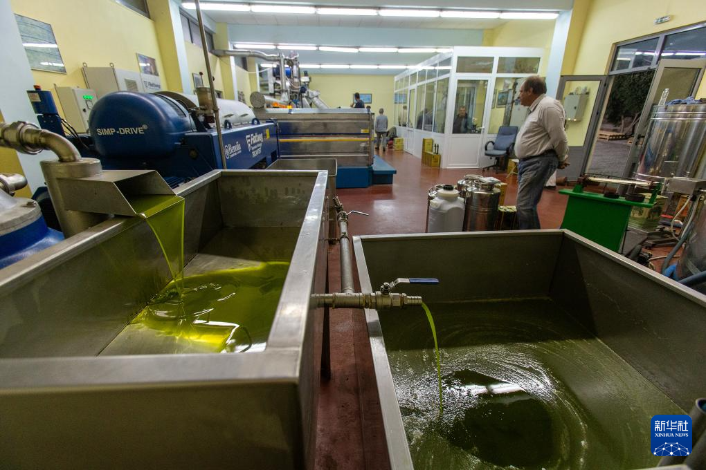 10月31日,在甘肃省陇南市武都区一家油橄榄加工企业,工作人员查看初榨橄榄油品质。