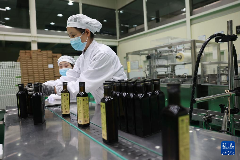 10月31日,在甘肃省陇南市武都区一家油橄榄加工企业,工作人员在生产线上作业。