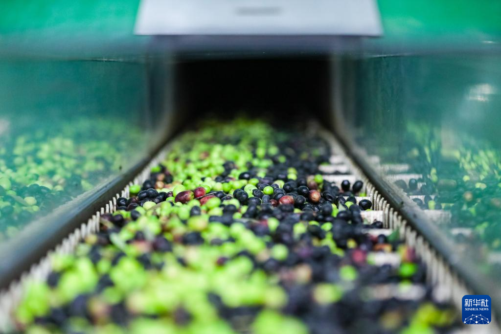 这是10月31日在甘肃省陇南市武都区一家油橄榄加工企业生产线上拍摄的油橄榄鲜果。