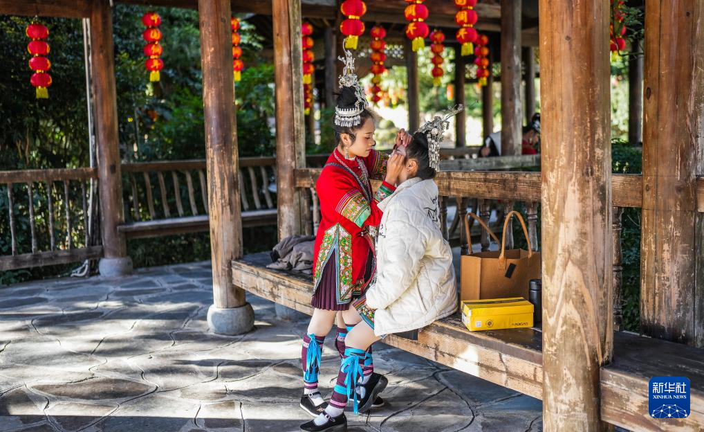11月29日,侗族村民在黎平县肇兴侗寨寨门口补妆。