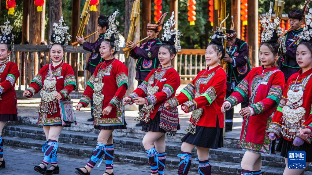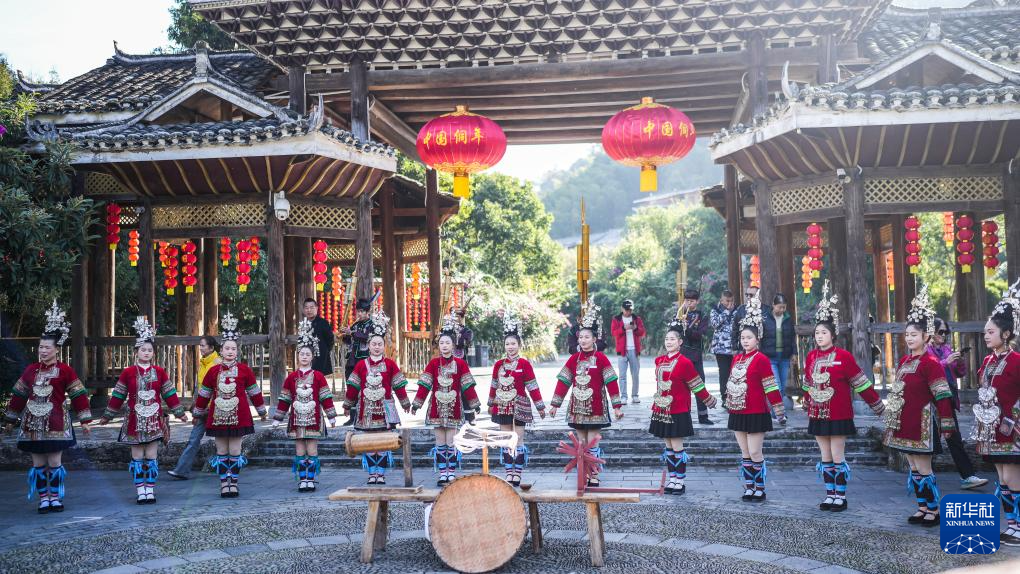 11月29日,侗族群众在黎平县肇兴侗寨寨门口表演舞蹈。