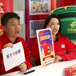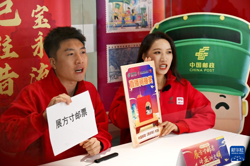 11月29日,邮乐直播间工作人员在中国2024亚洲国际集邮展览上进行直播。
