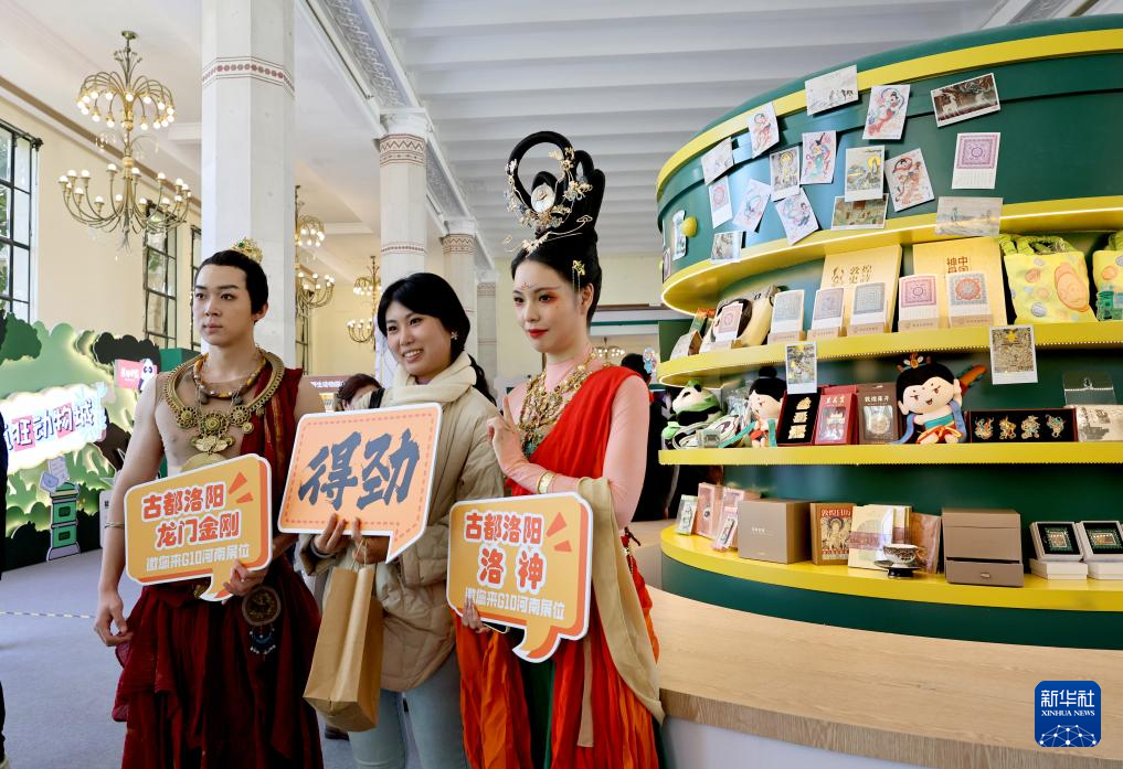 11月29日,参观者(中)与河南邮政的工作人员在展览现场合影。