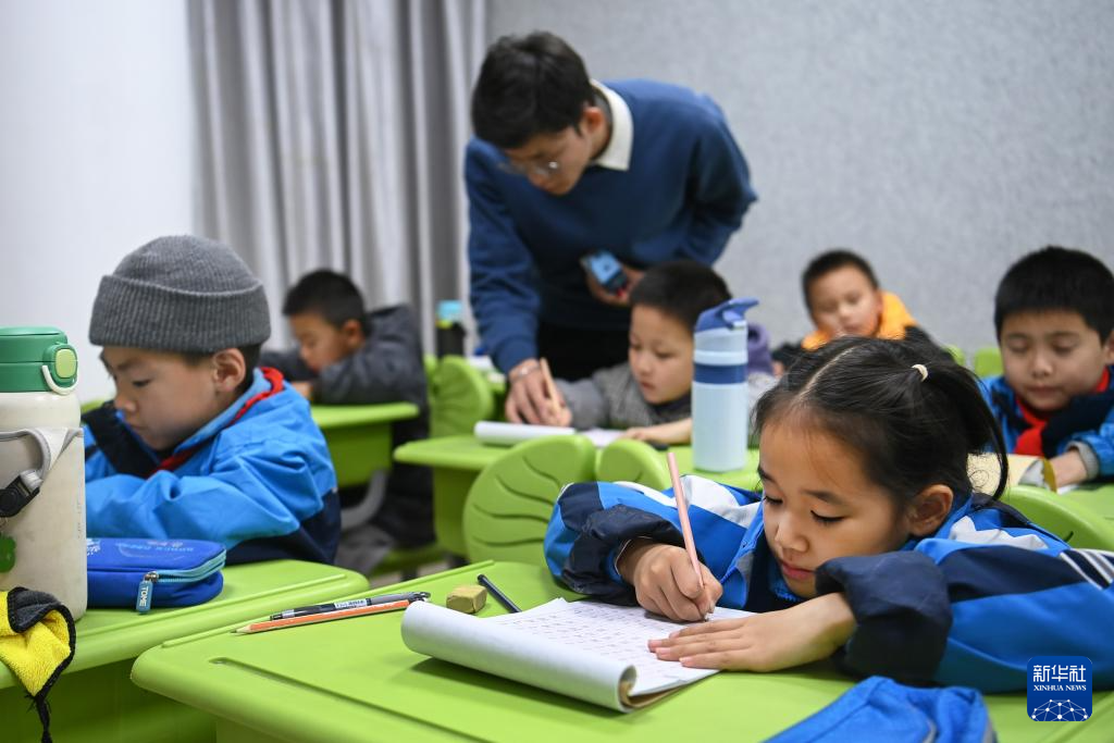 孩子们在西安市未央区浐灞半岛社区少年宫上书法课(11月29日摄)。