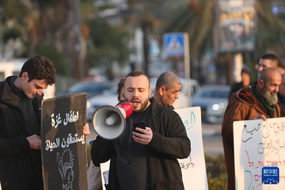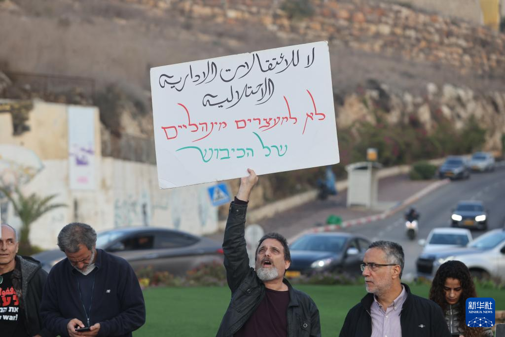 11月29日,在以色列北部乌姆费赫姆,生活在以色列的阿拉伯民众手持标语举行游行。