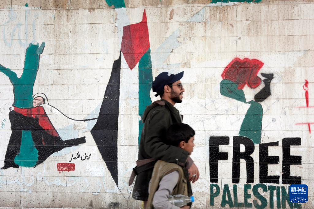 11月29日,在也门首都萨那,一名男子和他的孩子在游行活动中走过声援巴勒斯坦的艺术涂鸦。