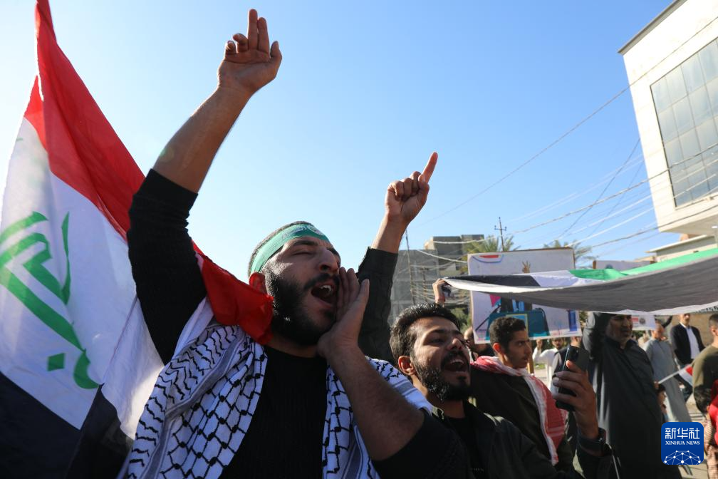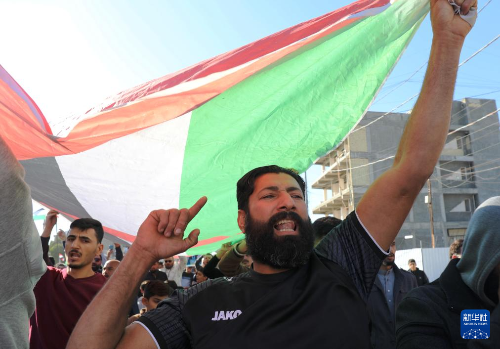 11月29日,人们在伊拉克首都巴格达参加声援巴勒斯坦人民的游行。