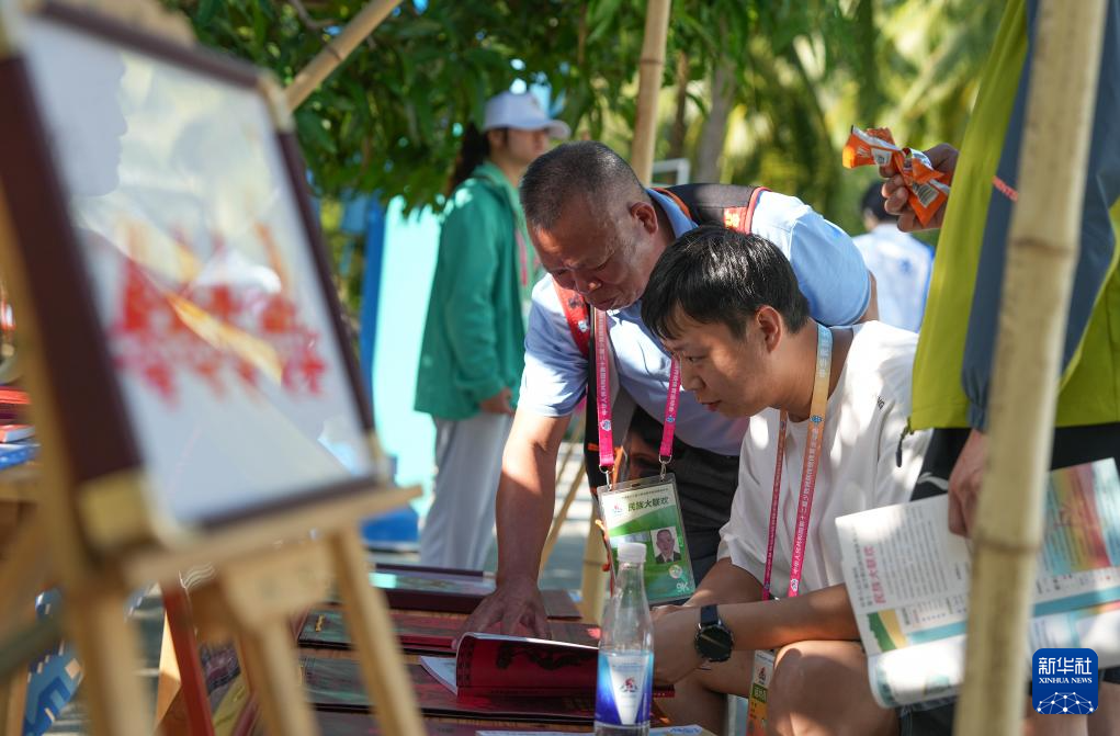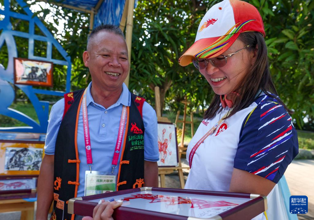在海南三亚天涯海角游览区内,第十二届全国少数民族传统体育运动会民族大联欢活动的黎族传统剪纸展位前,来自海南省乐东黎族自治县大安镇的林文生介绍着他的剪纸作品。