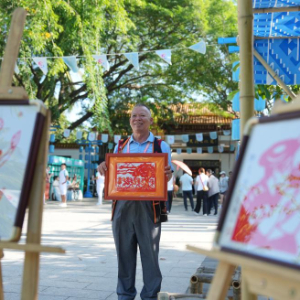 林文生在民族大联欢活动现场展示剪纸作品(11月26日摄)。