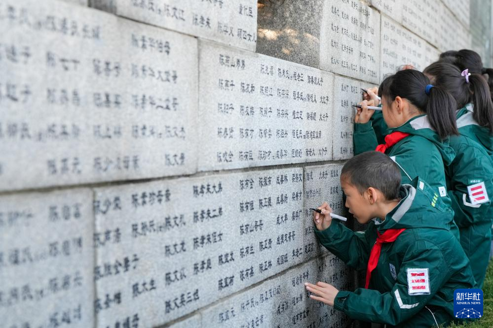 12月1日,参加活动的小学生用黑笔给“哭墙”上的名字“描新”。