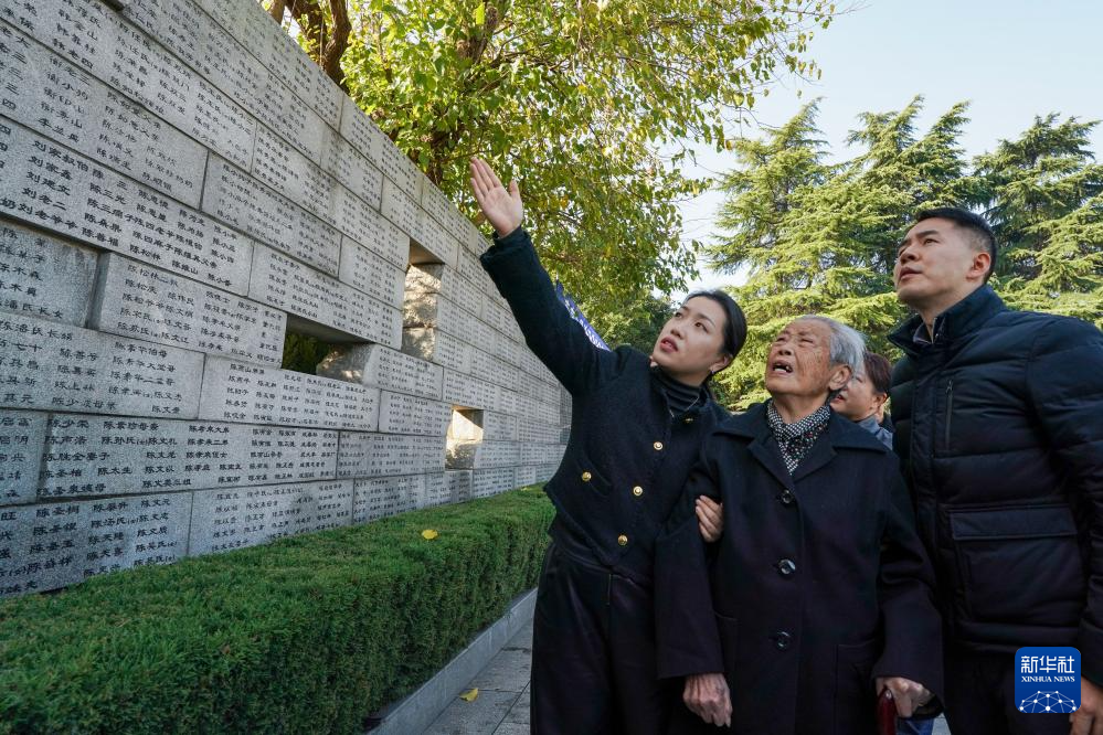 12月1日,南京大屠杀幸存者艾义英(右二)和家人在南京大屠杀遇难同胞纪念馆的“哭墙”上寻找家人姓名。