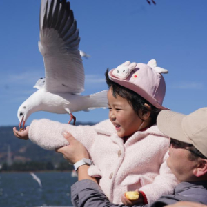 12月1日,一名小朋友在昆明滇池海埂观景大道投喂红嘴鸥。