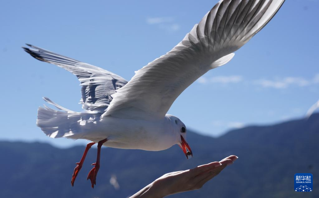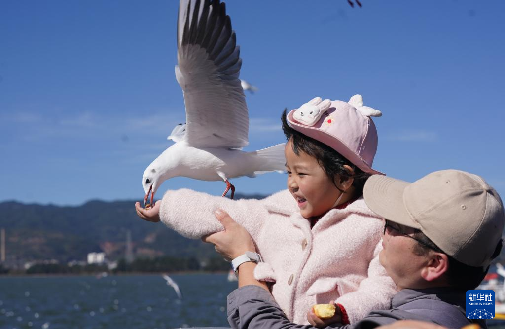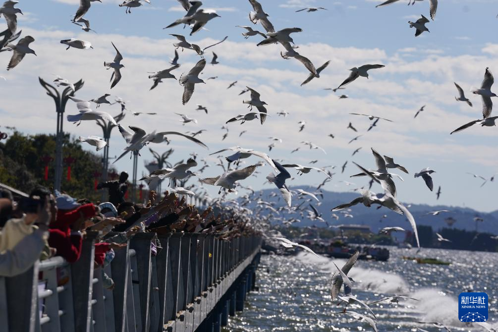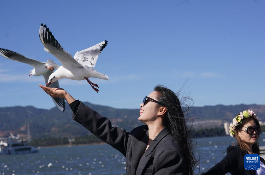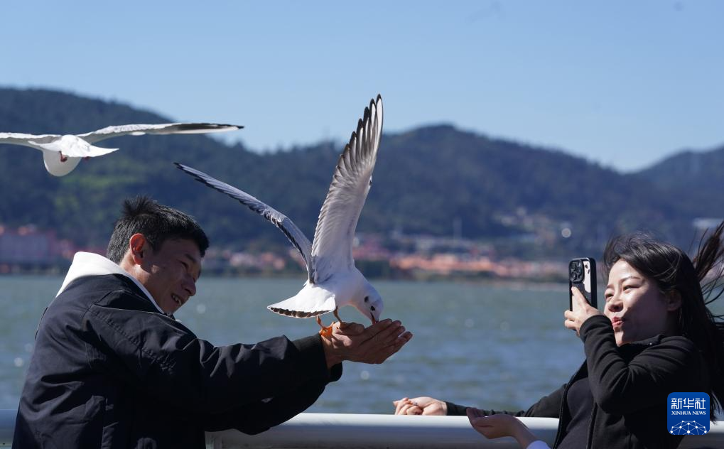 12月1日,游客在昆明滇池海埂观景大道投喂红嘴鸥。