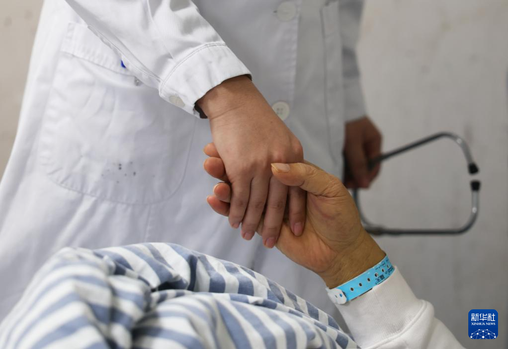 11月21日,在南宁市第四人民医院感染科一病区病房,赵蕊与病人握手。